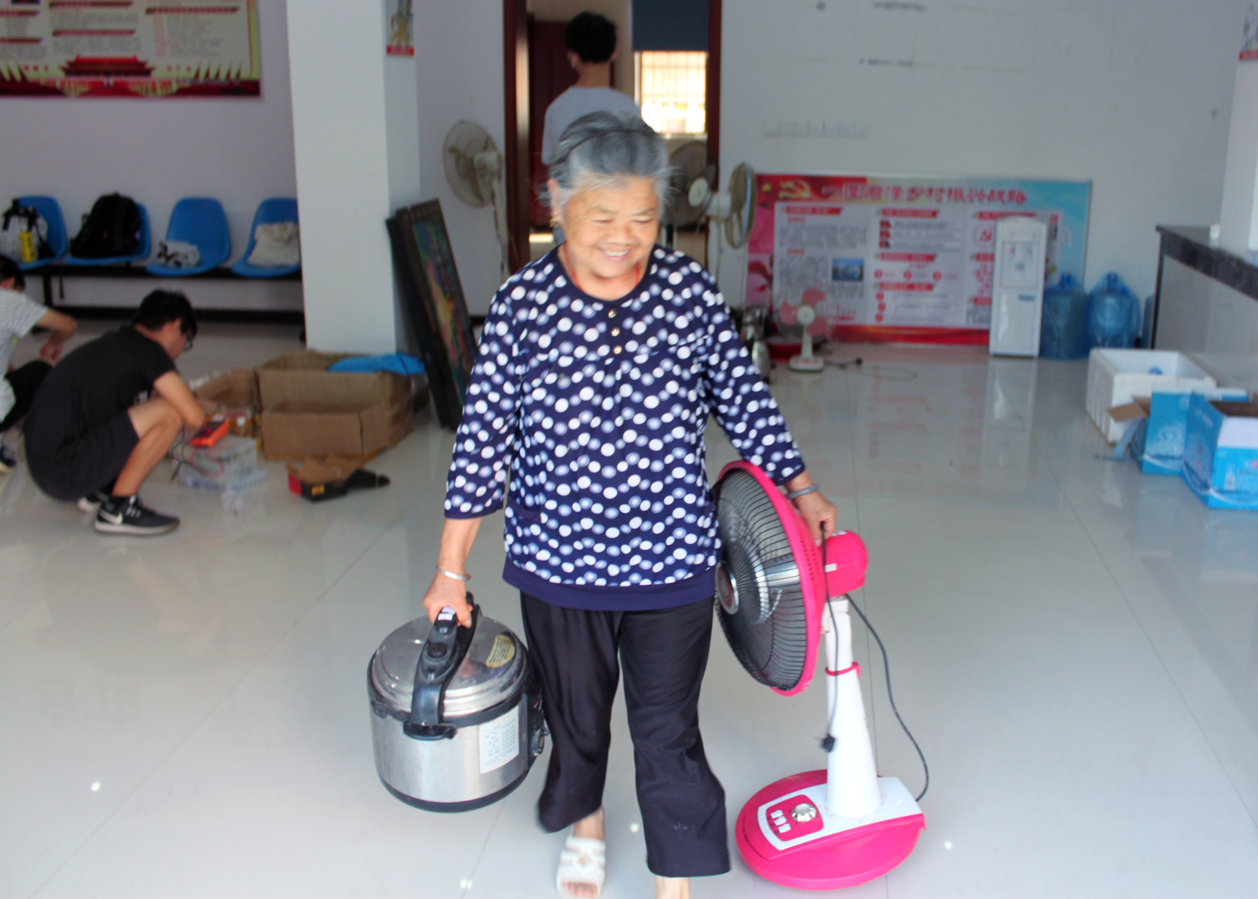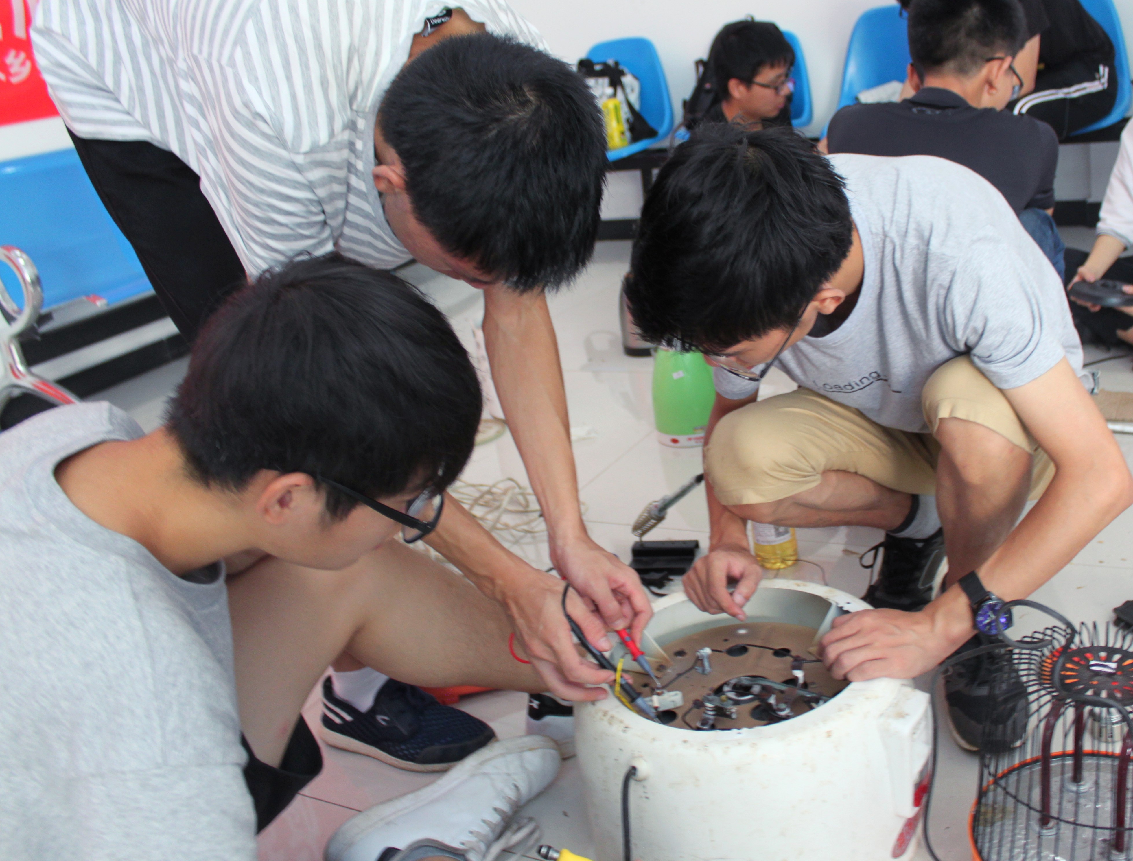 三下乡队伍中,还有一批专业技术骨干——信电协会的成员们。他们摆开电焊板、螺丝刀、电圈等工具时,老乡们更兴奋了,纷纷往家赶,拿来自己坏掉的烧水壶、电风扇、电饭煲等家电,志愿者团队在信电协会的带领下修好了一件件的家电。手提电风扇的一位大叔告诉志愿者:“村民家中有很多坏掉的电器,拿到外面去修十分不方便,这次志愿者的到来给我们村中提供了很大的帮助。”大叔脸上露出淳朴的笑容,并向志愿者们一再表示感谢。大叔说:“如果你们志愿者能经常来就好了,我们农村人没有什么文化看不懂说明书总把家电弄坏,你们要是在的话我们就不用发愁了。”